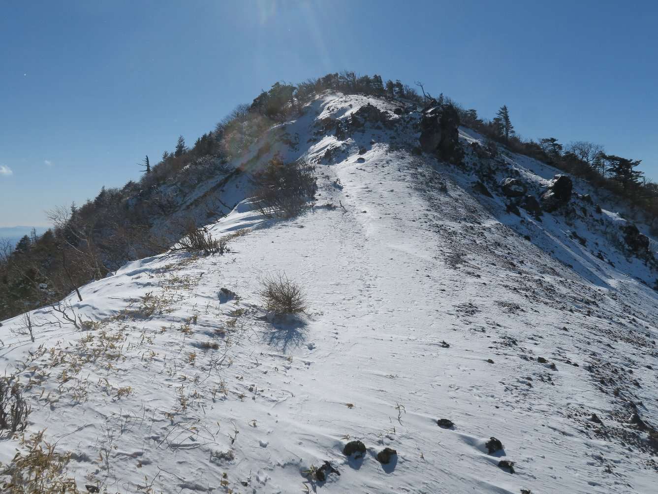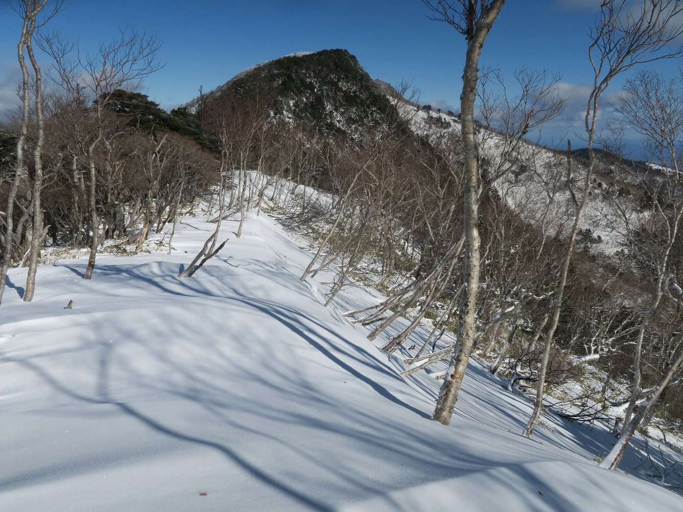 その先で上に向かって左の斜面を登り上げます。ここは雪が多いと分かりにくく、ちょっと急で危ないかと思います。
