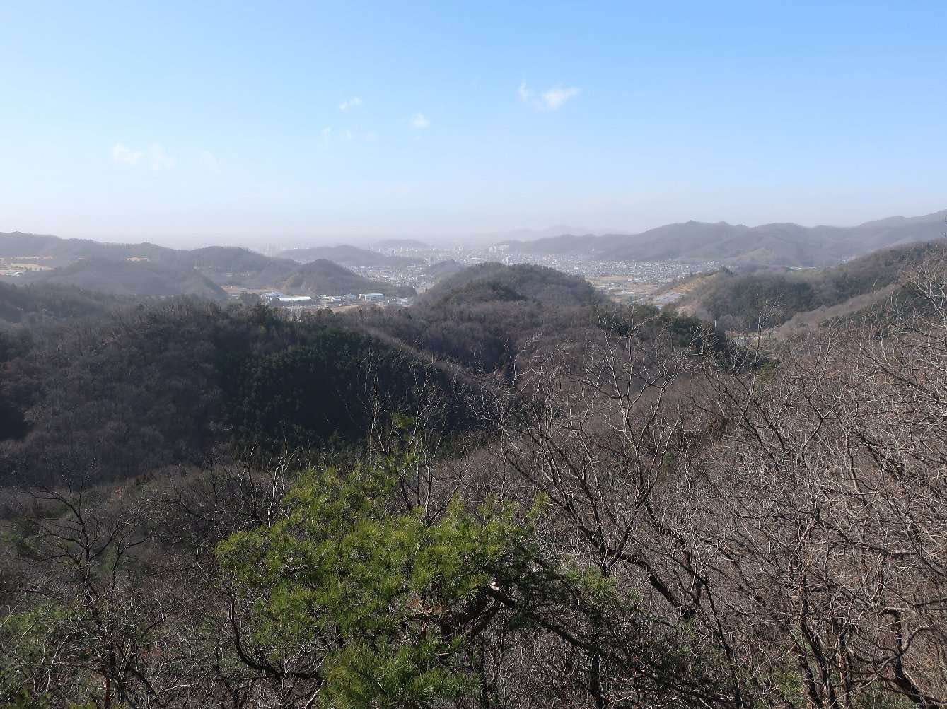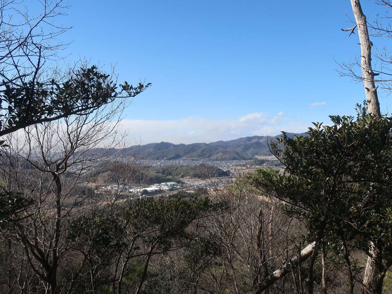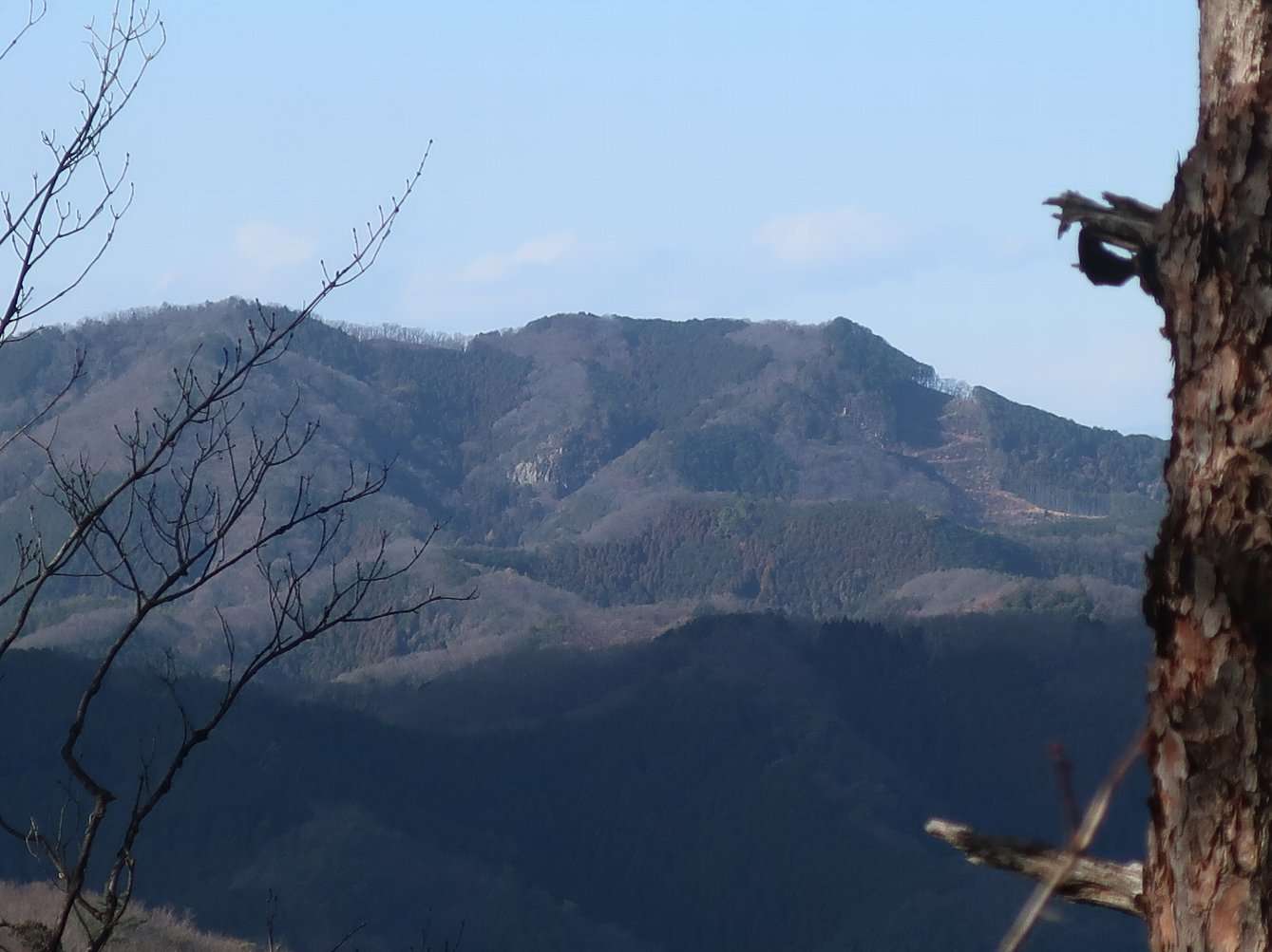 手前の伐採地あたりがワイン山でしょう。後方に行道山の岩(暗い部分の中腹)と北尾根の木が無い展望地が見えますね(写真をクリックで拡大可)
