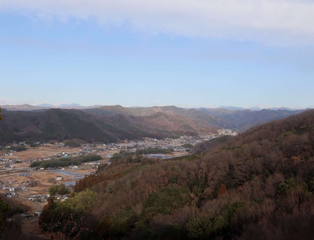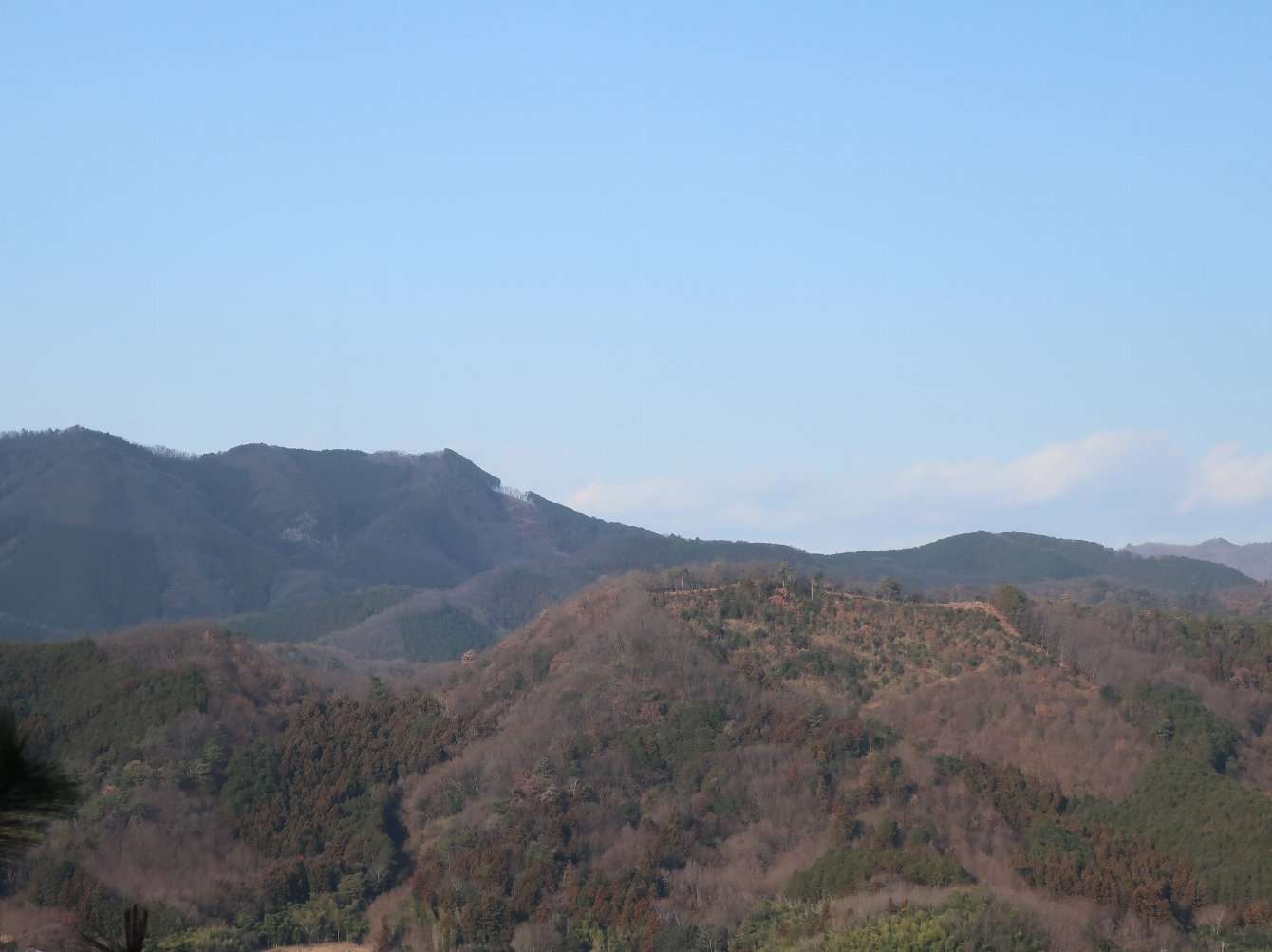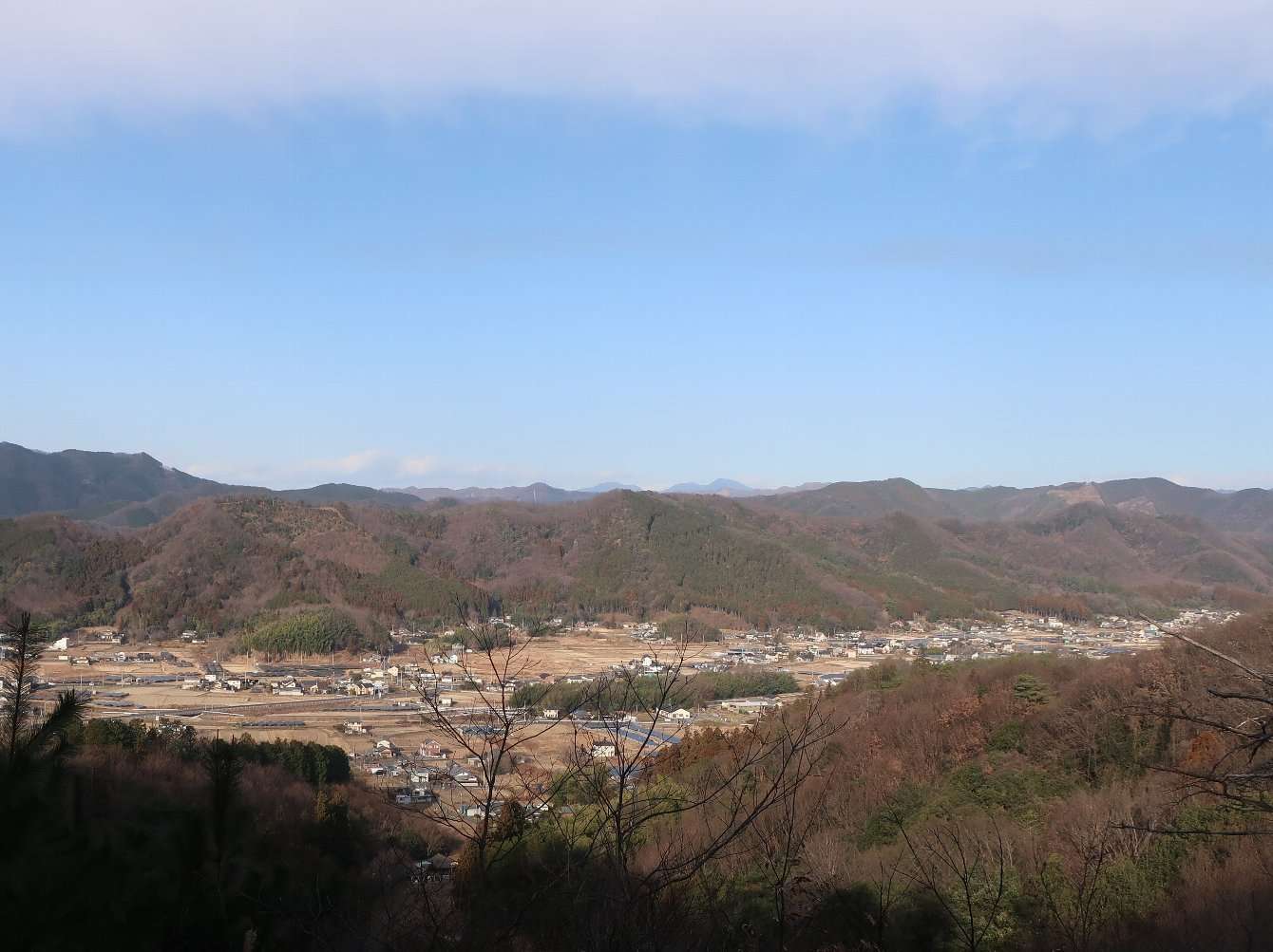 手前の伐採地あたりがワイン山でしょう。後方に行道山の岩(暗い部分の中腹)と北尾根の木が無い展望地が見えますね(写真をクリックで拡大可)