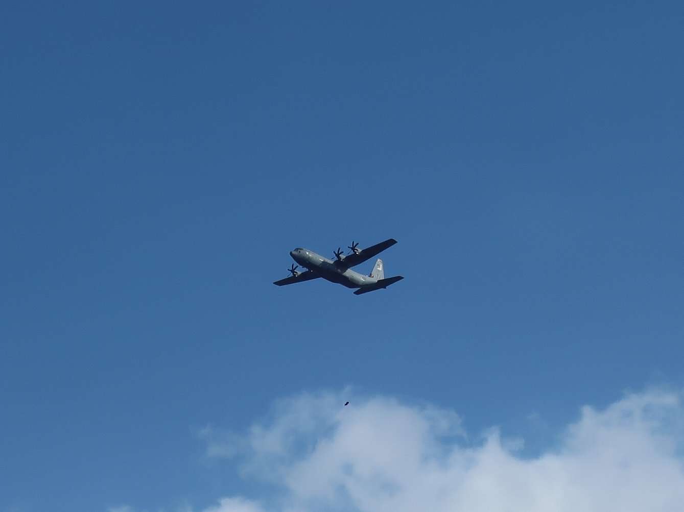最後は法面をかわして東の脇から車道へ降り立つ。ちょうど自衛隊機が通過(写真をクリックで拡大可)